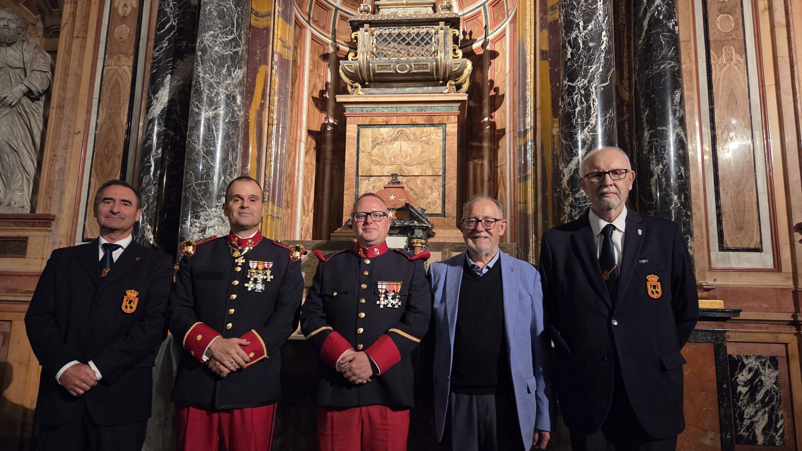 Foto de los representantes de nuestra Hermandad con el Director de la Música y el Cabo 1º solista/tenor y vídeo del tenor, cantando «La Banderita» (Las Corsarias).