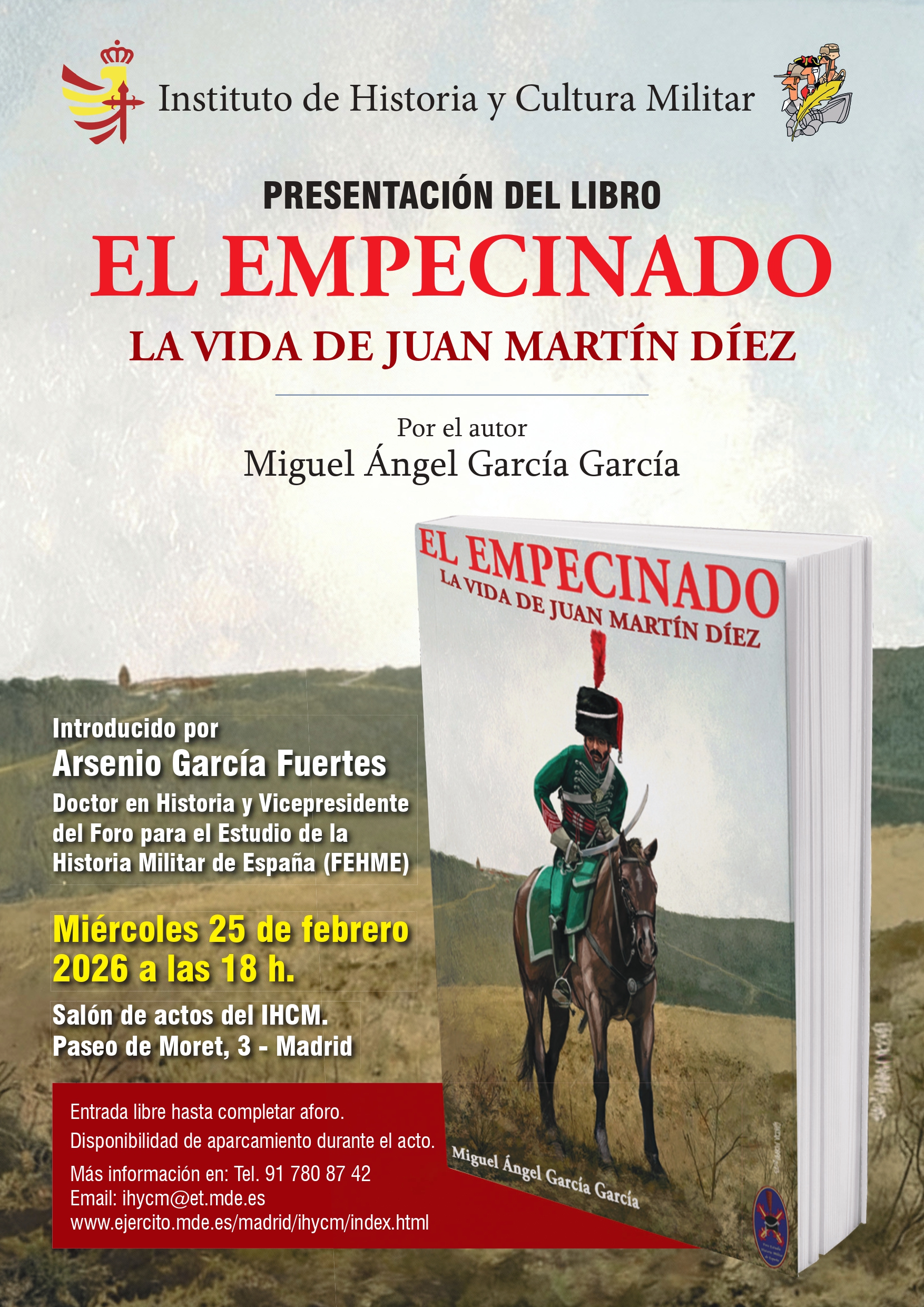 El miércoles 25 de febrero de 2026, a las 18 h., está prevista la presentación del libro EL EMPECINADO. La vida de Juan Martín Díez, en el salón de actos “Ejército Español” del Instituto de Historia y Cultura Militar, sito en el paseo de Moret, núm. 3, de Madrid, siendo la entrada libre hasta completar aforo y existiendo disponibilidad de aparcamiento durante el acto.